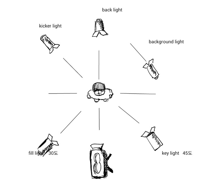 기본 조명 3개는 가지고 댕기시는게 좋죠. (1개는 예비로 더 챙기서도 좋습니다) 요즘은 LED도 싸게 나와서 아주 맘에 듭니다. 조명 설계하시다 정 모르시겠으면 이 사진 처럼 하세요.