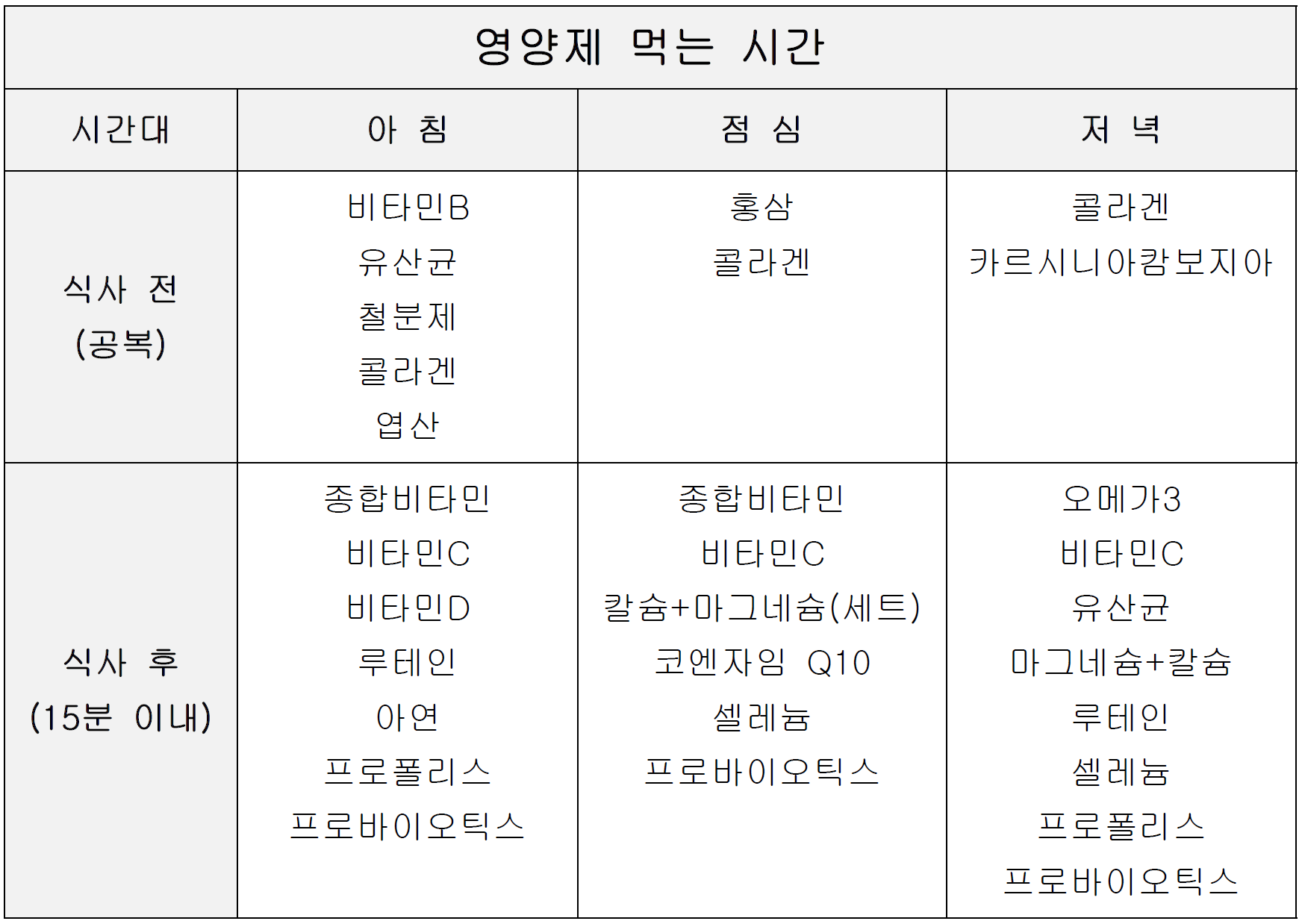 좋은조합 : 항산화 효과를 위해 비타민E, 셀레늄, 베타카로틴, 철분제