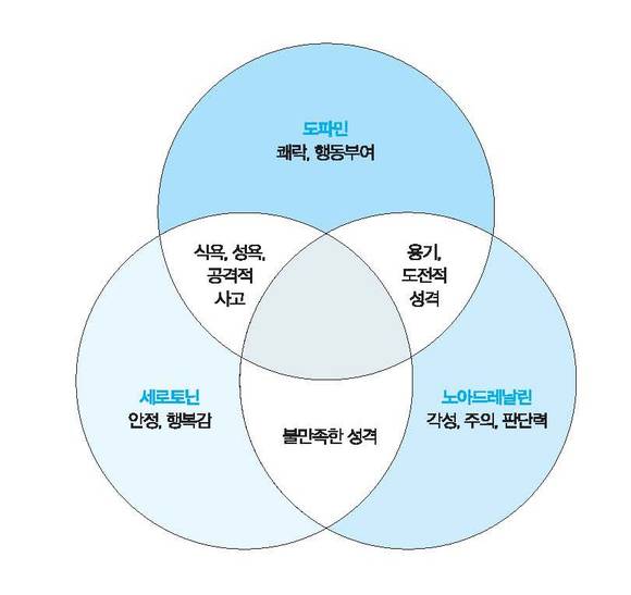인체의 신경전달물질로 도파민, 노아드레날린, 세로토닌이 있다.