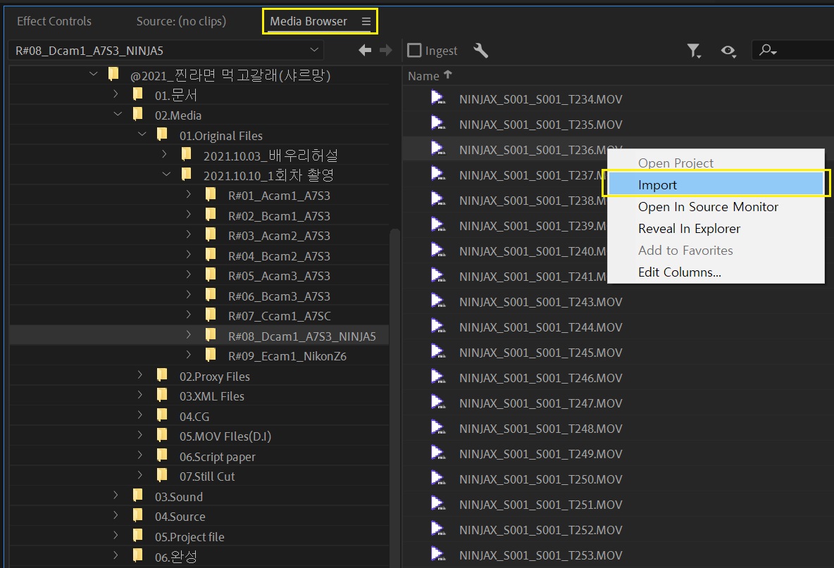 프리미어로 소스파일을 가져올 때 마우스로 드래그해서 Import 하는 경우가 있다. 하지만 이 과정에서 눈에 보이지 않는 에러가 발생할 수 있다. Adobe와 카메라 제조업체에서는 반드시 Media Browser을 통해서 Import를 해야 안전하다고 안내한다.
