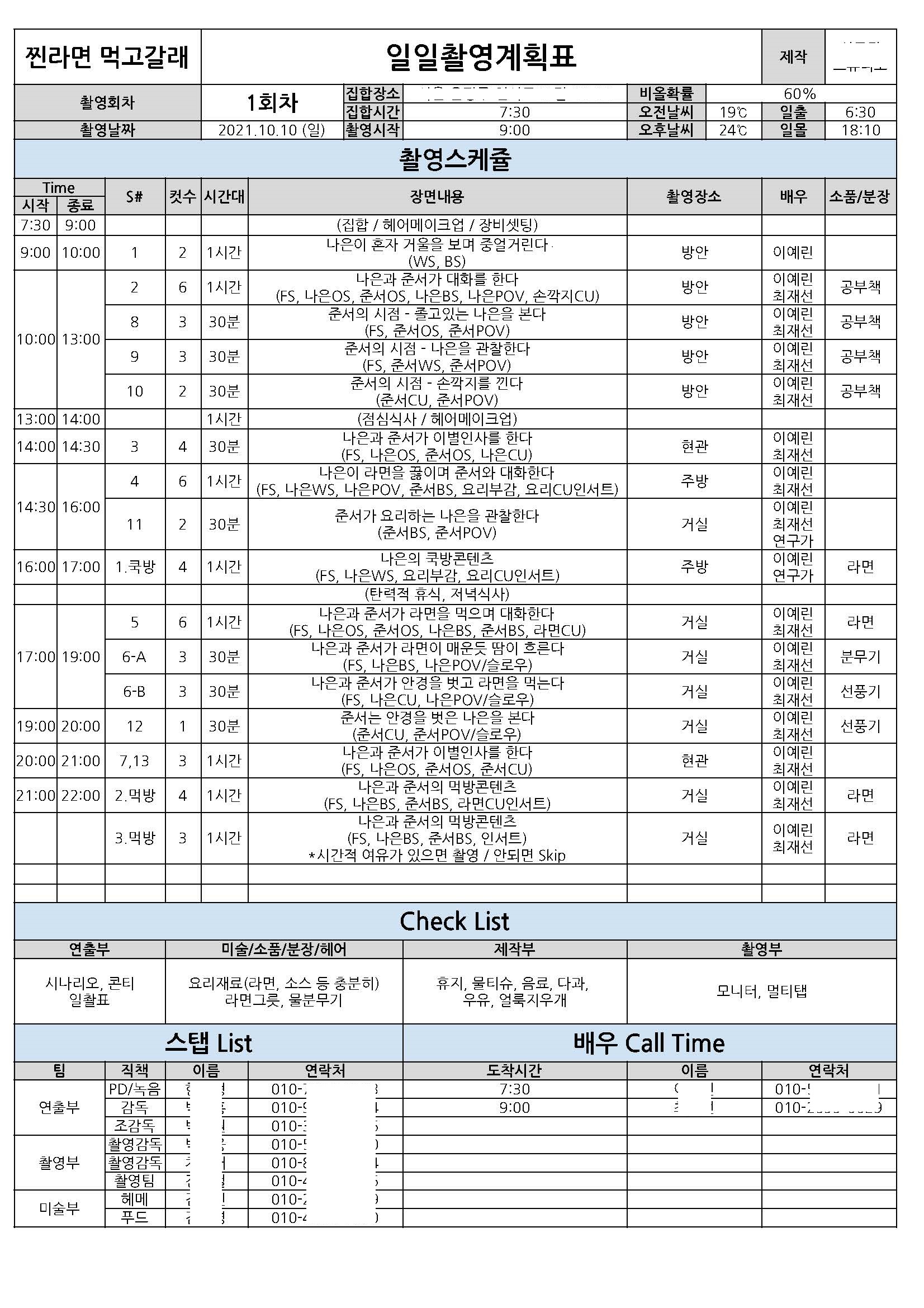 프로덕션(Production) 및 일촬표, 촬영도면도