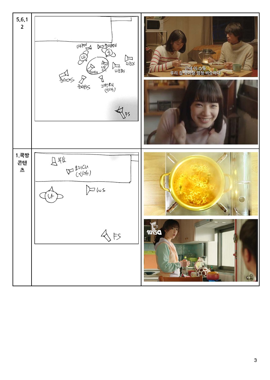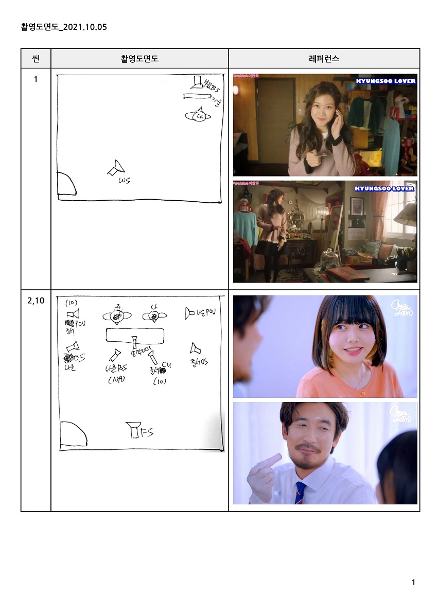 촬영감독이 구도를 미리 셋팅할 수 있도록 원하는 카메라 배치도를 미리 그려서 제공하였고, 배우에게는 감독이 원하는 연기 스타일의 영상을 참고로 제공하여 현장에서 고민의 시간을 단축 하기 위해 노력하였다.