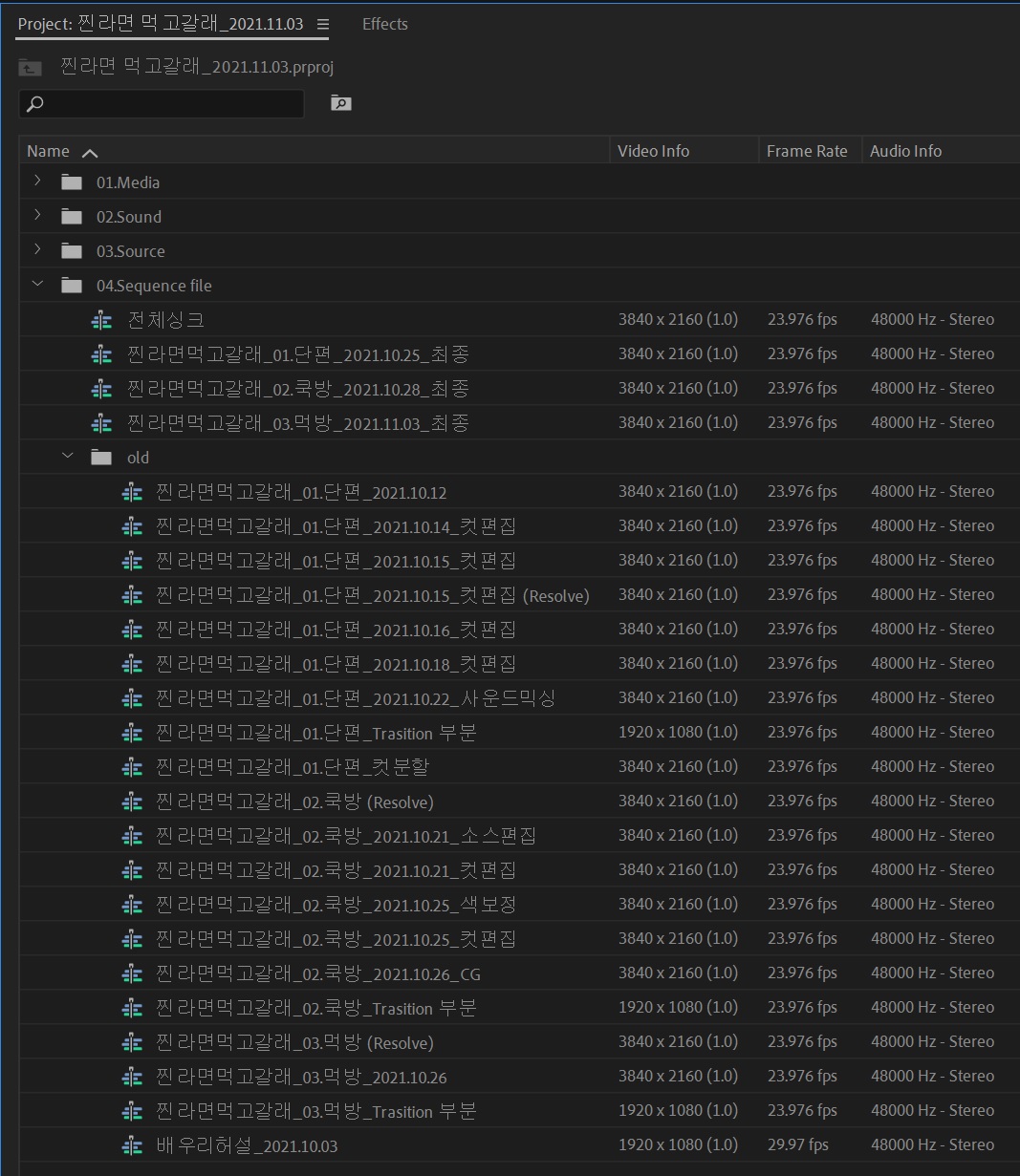 영상편집 작업 팁 영상을 편집을 할 때 하나의 시퀀스에서 작업해서 끝내기 보단, 날짜별로 시퀀스를 만들고 작업내역이 살아있게 작업을 하는 것이 좋다. 어제의 아이디어나 최초의 아이디어