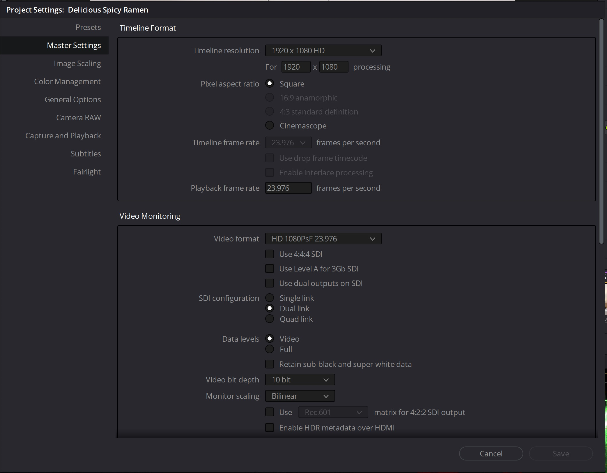 최종 아웃풋에 맞게 1920x1080, 23.976frame으로 셋팅하였다. 사실 필자의 작업 PC는 4K로 색보정을 하는데 조금 무리가 있다.