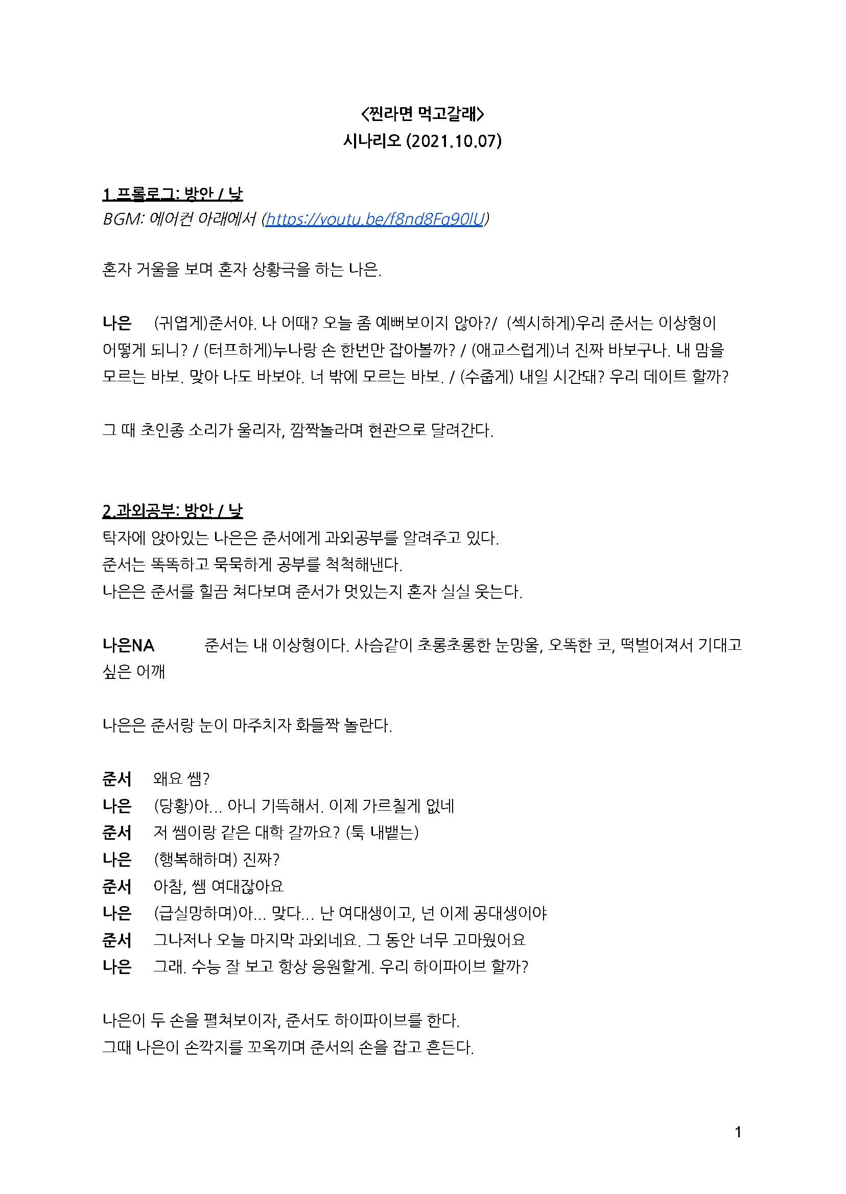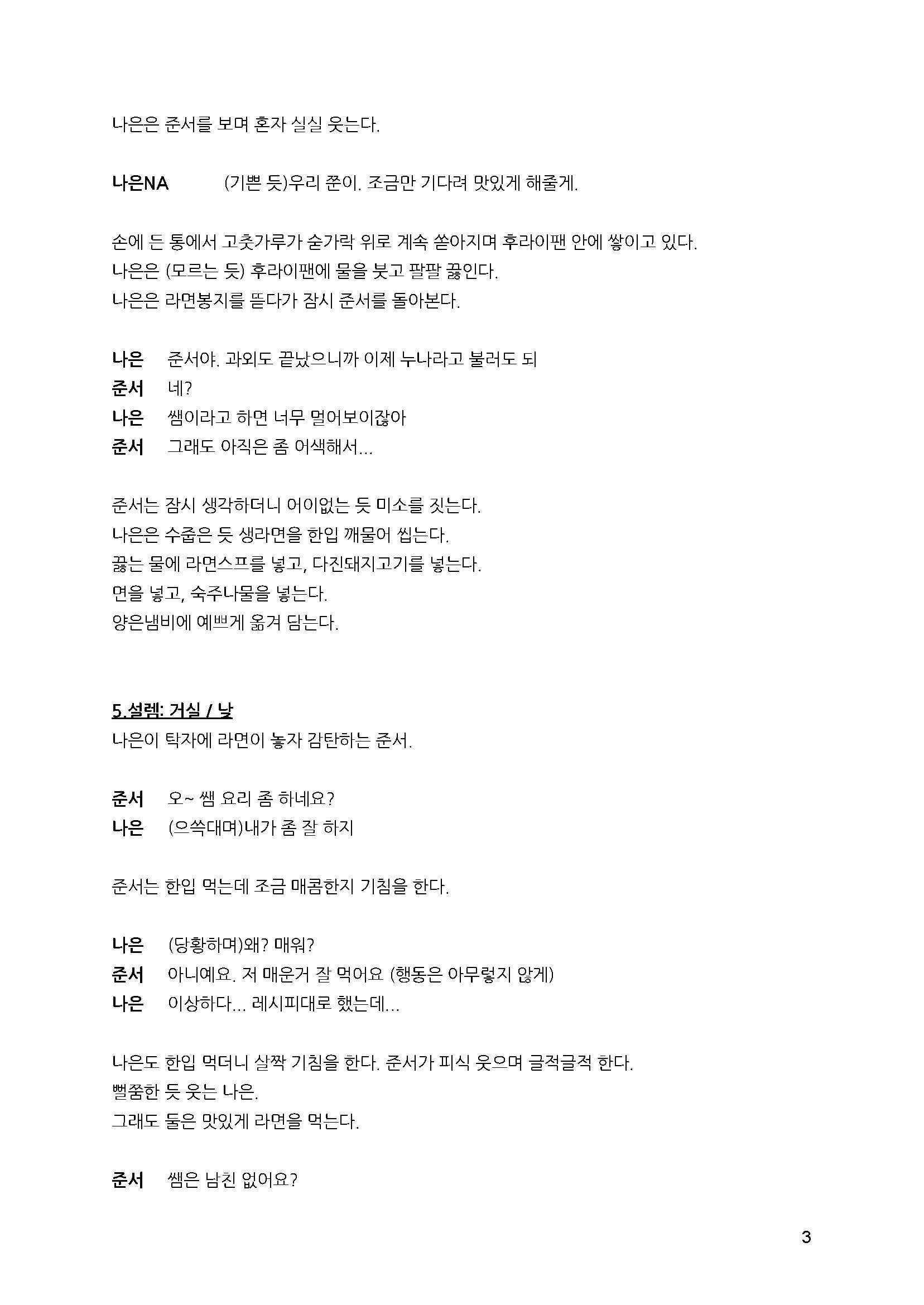 시나리오는 정통적인 영화보다 숏폼 콘텐츠(웹 드라마)의 느낌이 날 수 있게 작성하였다. 현재의 트렌드에 맞춰 짧은 러닝타임 안에서 가볍고 부담 없이 볼 수 있게 하면서도, 영화적 깊이도 함께 담고 싶은 욕심이 있었다. 서로에게 호감이 있는 과외 선생(나은)과 제자(준서)가 마지막 수업이 끝난 뒤 찐라면(음식)을 먹으며 대화를 나눈다는 이야기이다.