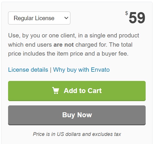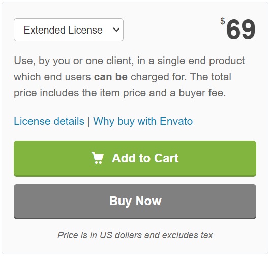 Regular 라이선스는 $59 (약 7만 1천 원), Extended 라이선스는 $69 (약 8만 3천 원)이다. 상업적인 관점에서 보면 굉장히 저렴한 가격이다.