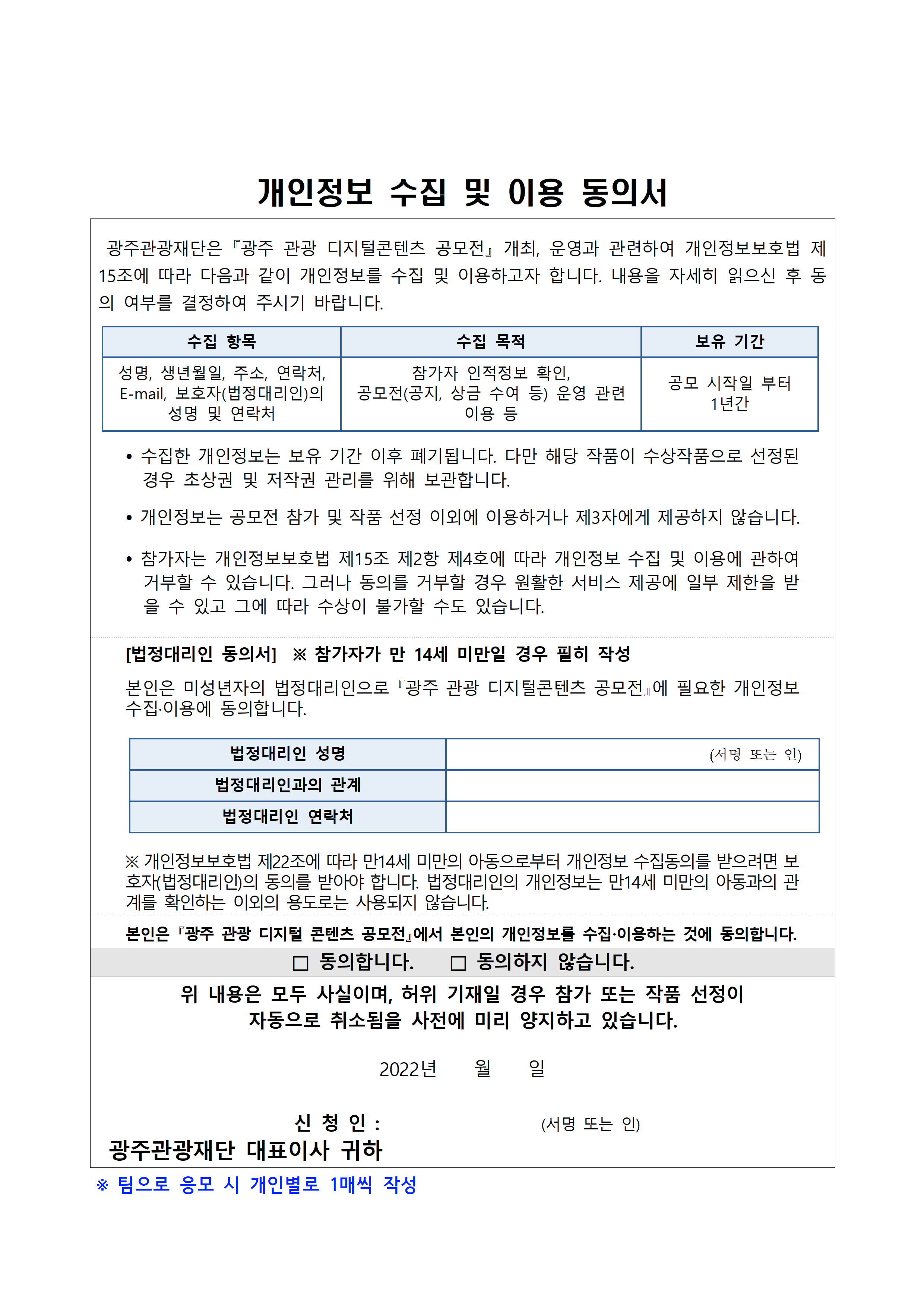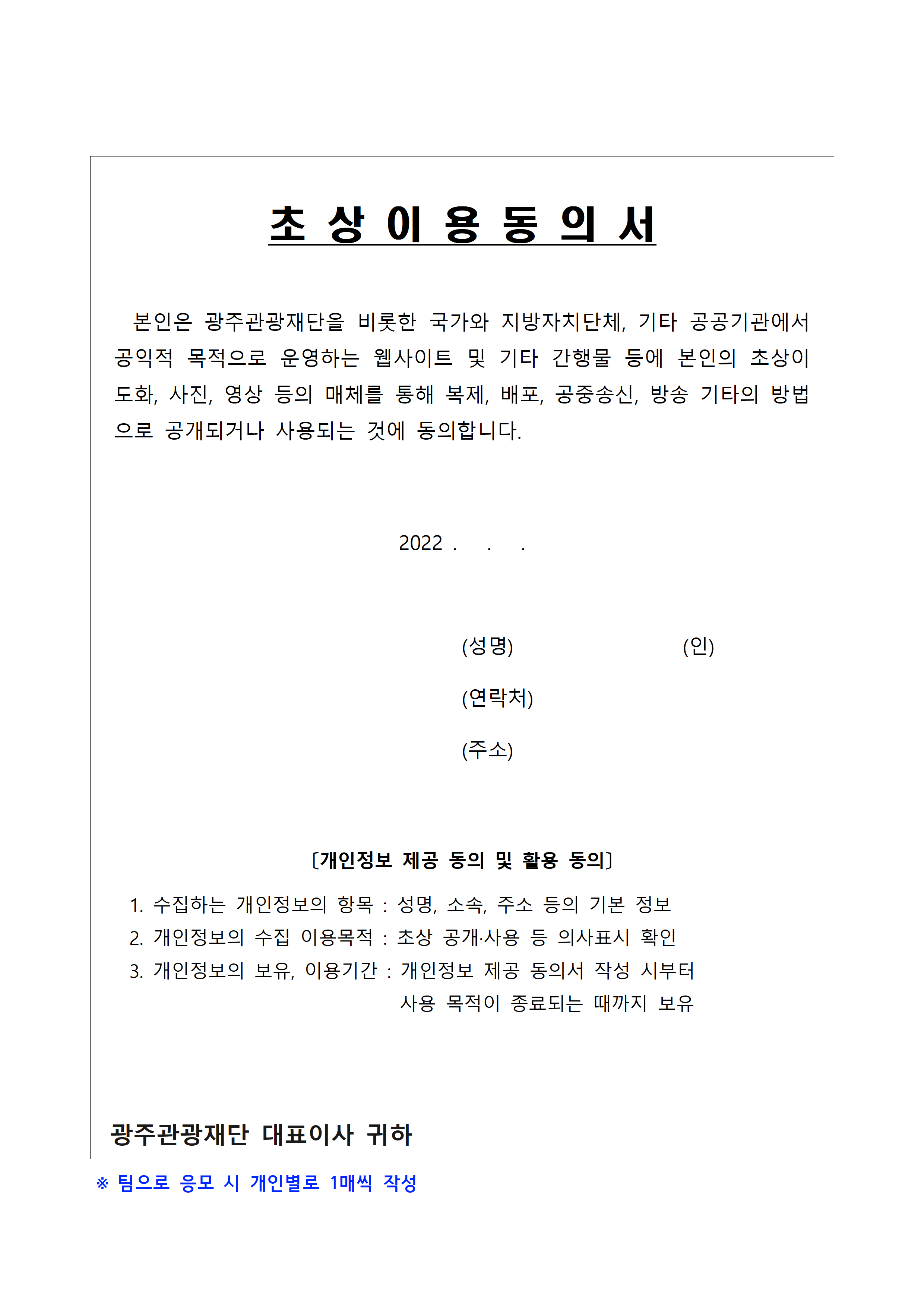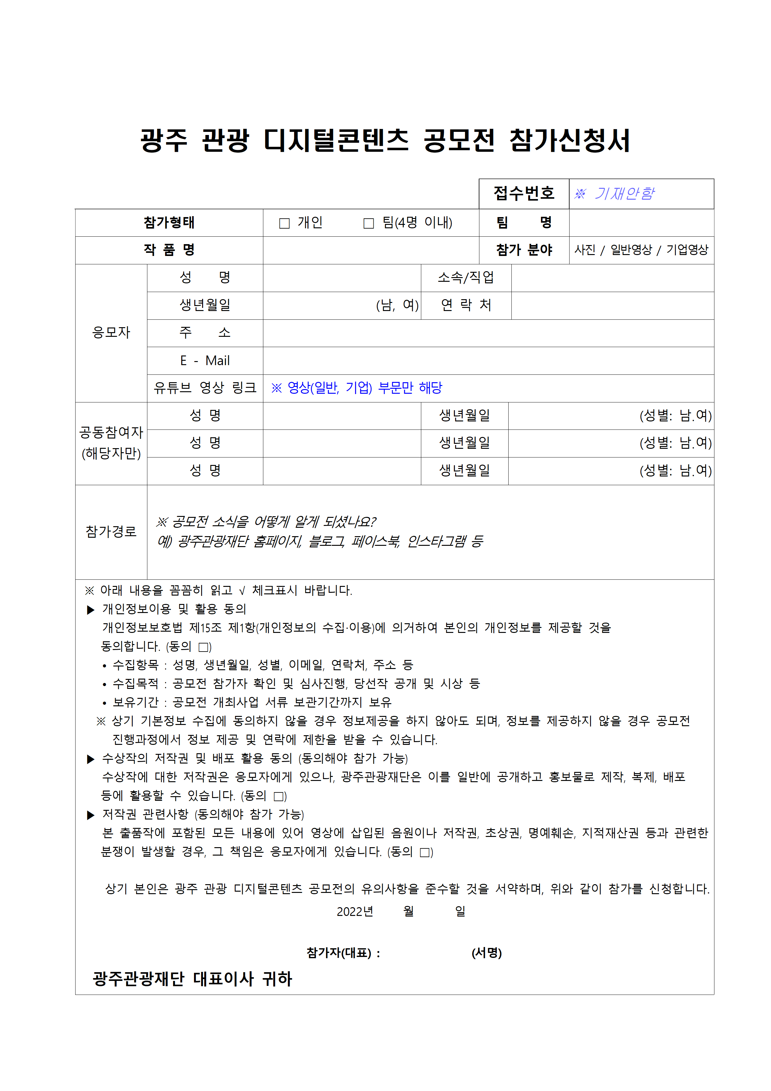 ※ 제출 후 확인 전화 요망 ((재)광주관광재단 관광마케팅팀 / ☎ 062-611-3633