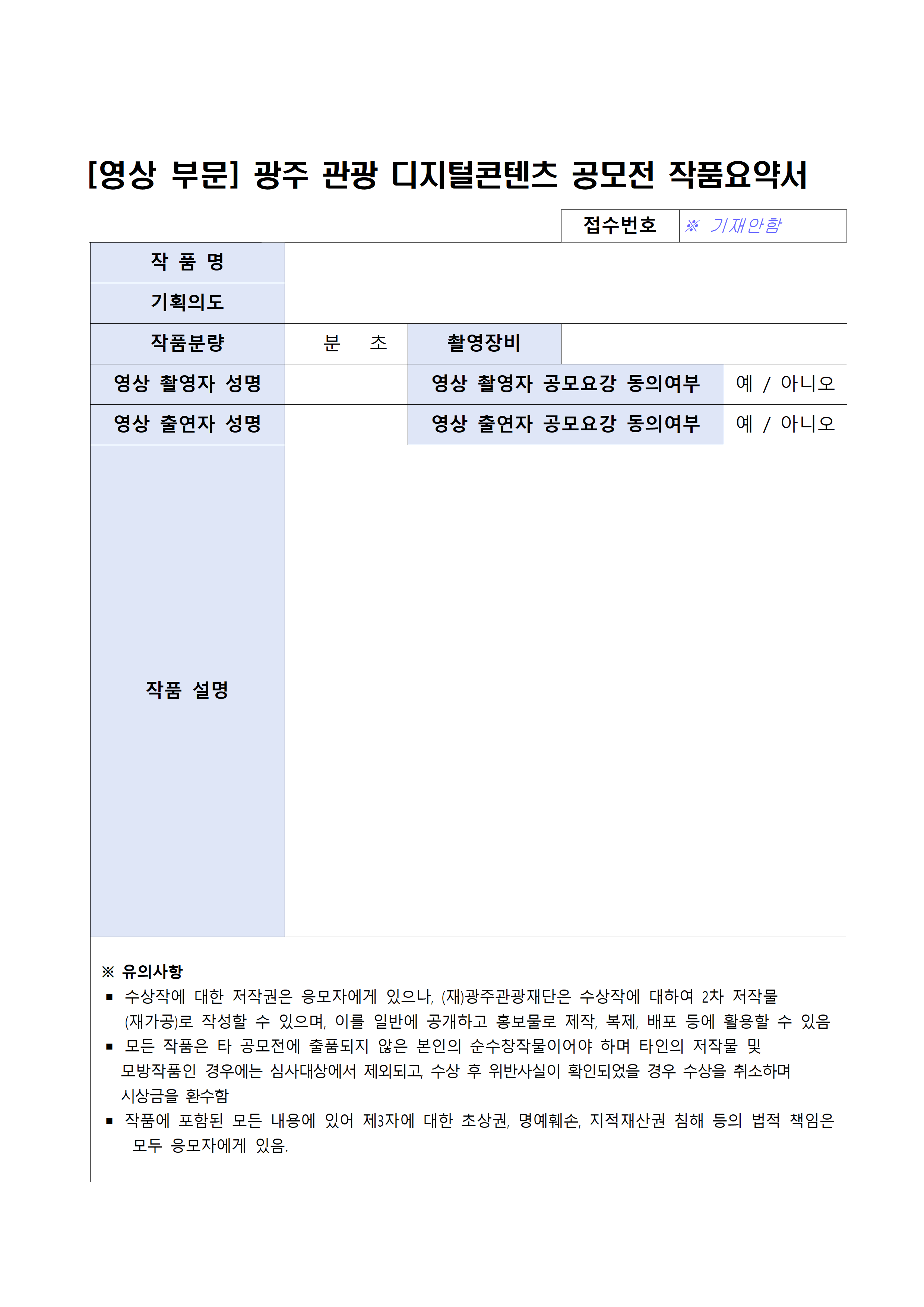 - 영상 시작 부분에 ‘광주 관광 콘텐츠 공모전 출품작’ 기재 필수