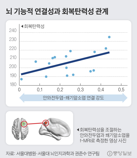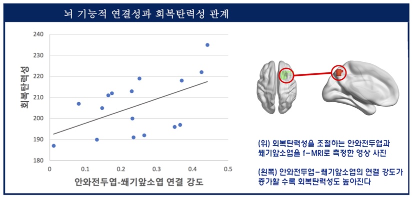 뇌는 여러 신경망과의 다양한 연결을 통해 주변의 어려움에 적응하는 기능을 갖는다. 보수성향의 사람들은 자기조절능력이나 회복탄력성과 관련이 있는 뇌 기능적 연결성이 진보보다 약 5배 높게 나타났다. 즉, 보수성향의 뇌는 심리적 안정성이 진보성향의 사람보다 높은 것이라고 연구팀은 설명했다.