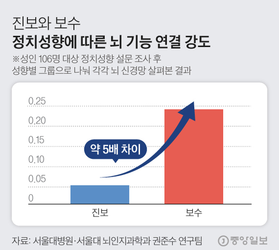 권 교수는 “정치적 성향에 따라 뇌기능의 차이가 생겨난 것인지, 뇌기능 차이로 인해 정치적 성향이 다른지는 알 수 없지만 정치적 입장에 따라 뇌의 차이가 있는 것은 사실”이라고 했다.